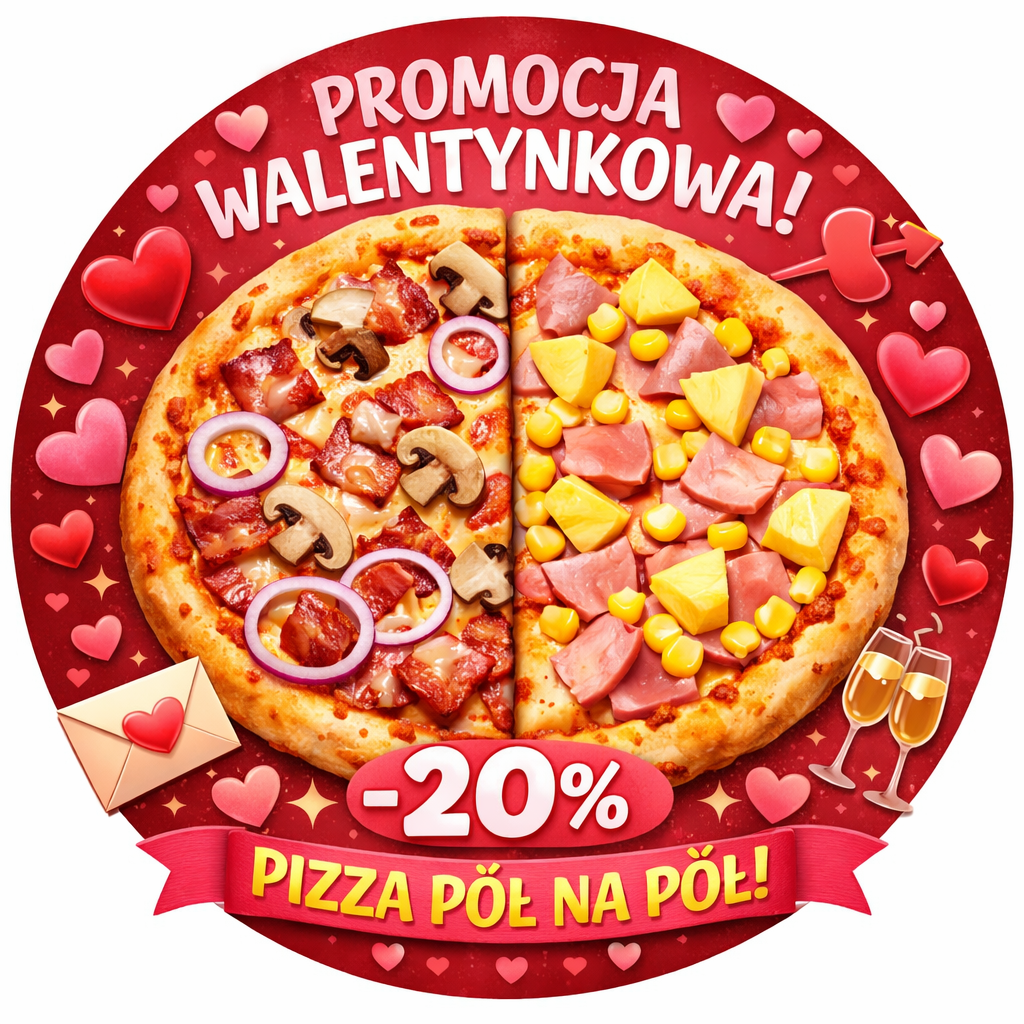 Sos pomidorowo-ziołowy (pod ser), Mozzarella , Kabanos , Oliwki czarne, Papryka pepperoni , Płatki Chilli , Tabasco (na pizzę) -